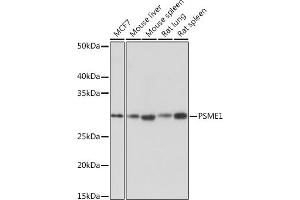The 26S proteasome is a multicatalytic proteinase complex with a highly ordered structure composed of 2 complexes, a 20S core and a 19S regulator. The 20S core is composed of 4 rings of 28 non-identical subunits, 2 rings are composed of 7 alpha subunits and 2 rings are composed of 7 beta subunits. The 19S regulator is composed of a base, which contains 6 ATPase subunits and 2 non-ATPase subunits, and a lid, which contains up to 10 non-ATPase subunits. Proteasomes are distributed throughout eukaryotic cells at a high concentration and cleave peptides in an ATP/ubiquitin-dependent process in a non-lysosomal pathway. An essential function of a modified proteasome, the immunoproteasome, is the processing of class I MHC peptides. The immunoproteasome contains an alternate regulator, referred to as the 11S regulator or PA28, that replaces the 19S regulator. Three subunits (alpha, beta and gamma) of the 11S regulator have been identified. This gene encodes the alpha subunit of the 11S regulator, one of the two 11S subunits that is induced by gamma-interferon. Three alpha and three beta subunits combine to form a heterohexameric ring. Alternative splicing results in multiple transcript variants. [provided by RefSeq, Jul 2013],HEL-S-129m, IFI5111, PA28A, PA28alpha, REGalpha,Cell Biology & Developmental Biology,Ubiquitin,PSME1