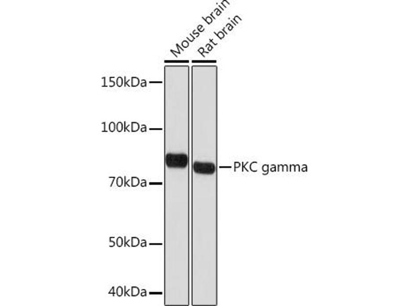 Protein kinase C (PKC) is a family of serine- and threonine-specific protein kinases that can be activated by calcium and second messenger diacylglycerol. PKC family members phosphorylate a wide variety of protein targets and are known to be involved in diverse cellular signaling pathways. PKC also serve as major receptors for phorbol esters, a class of tumor promoters. Each member of the PKC family has a specific expression profile and is believed to play distinct roles in cells. The protein encoded by this gene is one of the PKC family members. This protein kinase is expressed solely in the brain and spinal cord and its localization is restricted to neurons. It has been demonstrated that several neuronal functions, including long term potentiation (LTP) and long term depression (LTD), specifically require this kinase. Knockout studies in mice also suggest that this kinase may be involved in neuropathic pain development. Defects in this protein have been associated with neurodegenerative disorder spinocerebellar ataxia-14 (SCA14). Two transcript variants encoding different isoforms have been found for this gene. [provided by RefSeq, Oct 2015],PKC-gamma, PKCC, PKCG, SCA14,Apoptosis,Apoptosis_Inhibition of Apoptosis,Apoptosis_Mitochondrial Control of Apoptosis,B Cell Receptor Signaling Pathway,Cell Biology & Developmental Biology,Epigenetics & Nuclear Signaling,ErbB-HER Signaling Pathway,G protein signaling,G protein signaling_G-Protein-Coupled Receptors Signaling to MAPK/Erk,Immunology & Inflammation,Kinase,Kinase_Serine/threonine kinases,MAPK-Erk Signaling Pathway,Neurodegenerative Diseases,Neuroscience,Phospholipase Signaling Pathway,Signal Transduction,TGF-b-Smad Signaling Pathway,PRKCG