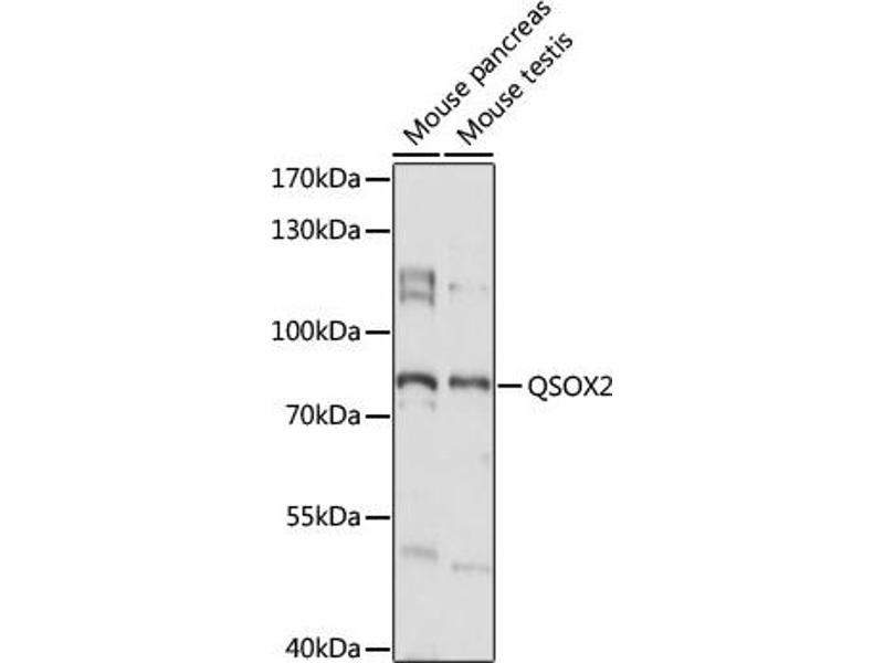 Der Kaninchen Polyklonal anti-QSOX2 Antikörper (ABIN7269780) detektiert spezifisch QSOX2 in WB.