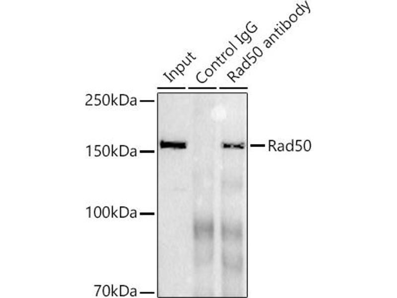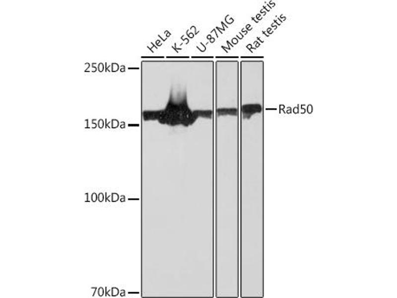 The protein encoded by this gene is highly similar to Saccharomyces cerevisiae Rad50, a protein involved in DNA double-strand break repair. This protein forms a complex with MRE11 and NBS1. The protein complex binds to DNA and displays numerous enzymatic activities that are required for nonhomologous joining of DNA ends. This protein, cooperating with its partners, is important for DNA double-strand break repair, cell cycle checkpoint activation, telomere maintenance, and meiotic recombination. Knockout studies of the mouse homolog suggest this gene is essential for cell growth and viability. Mutations in this gene are the cause of Nijmegen breakage syndrome-like disorder.[provided by RefSeq, Apr 2010],NBSLD, RAD502, hRad50,Cell Biology & Developmental Biology,Cell Cycle,DNA Damage & Repair,Epigenetics & Nuclear Signaling,G2/M DNA Damage Checkpoint,RAD50
