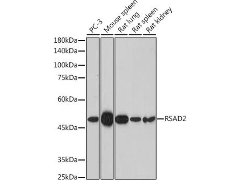 Interferon-inducible antiviral protein which plays a major role in the cell antiviral state induced by type I and type II interferon. Catalyzes the conversion of cytidine triphosphate (CTP to 3'-deoxy-3',4'-didehydro-CTP (ddhCTP via a SAM-dependent radical mechanism. In turn, ddhCTP acts as a chain terminator for the RNA-dependent RNA polymerases from multiple viruses and directly inhibits viral replication. Therefore, inhibits a wide range of DNA and RNA viruses, including human cytomegalovirus (HCMV, hepatitis C virus (HCV, west Nile virus (WNV, dengue virus, sindbis virus, influenza A virus, sendai virus, vesicular stomatitis virus (VSV, zika virus, and human immunodeficiency virus (HIV-1. Promotes also TLR7 and TLR9-dependent production of IFN-beta production in plasmacytoid dendritic cells (pDCs by facilitating 'Lys-63'-linked ubiquitination of IRAK1 by TRAF6. Plays a role in CD4+ T-cells activation and differentiation. Facilitates T-cell receptor (TCR-mediated GATA3 activation and optimal T-helper 2 (Th2 cytokine production by modulating NFKB1 and JUNB activities. Can inhibit secretion of soluble proteins.,RSAD2,2510004L01Rik,cig33,cig5,vig1,Immunology & Inflammation,RSAD2