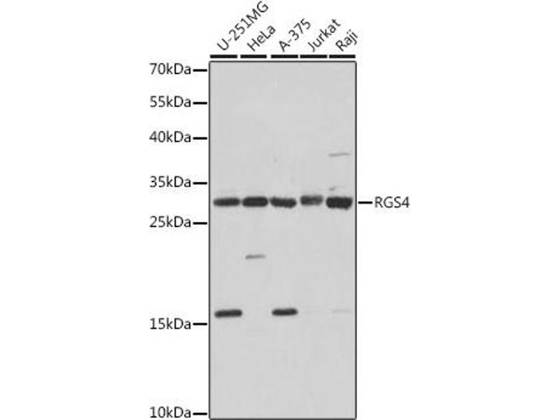 Regulator of G protein signaling (RGS) family members are regulatory molecules that act as GTPase activating proteins (GAPs) for G alpha subunits of heterotrimeric G proteins. RGS proteins are able to deactivate G protein subunits of the Gi alpha, Go alpha and Gq alpha subtypes. They drive G proteins into their inactive GDP-bound forms. Regulator of G protein signaling 4 belongs to this family. All RGS proteins share a conserved 120-amino acid sequence termed the RGS domain. Regulator of G protein signaling 4 protein is 37 % identical to RGS1 and 97 % identical to rat Rgs4. This protein negatively regulate signaling upstream or at the level of the heterotrimeric G protein and is localized in the cytoplasm. Alternatively spliced transcript variants have been found for this gene.,RGS4,RGP4,SCZD9,Signal Transduction,G protein signaling,Signal Transduction,G2/M DNA Damage Checkpoint,Cardiovascular,Heart,Cardiac arrhythmias,Hypertrophy,RGS4