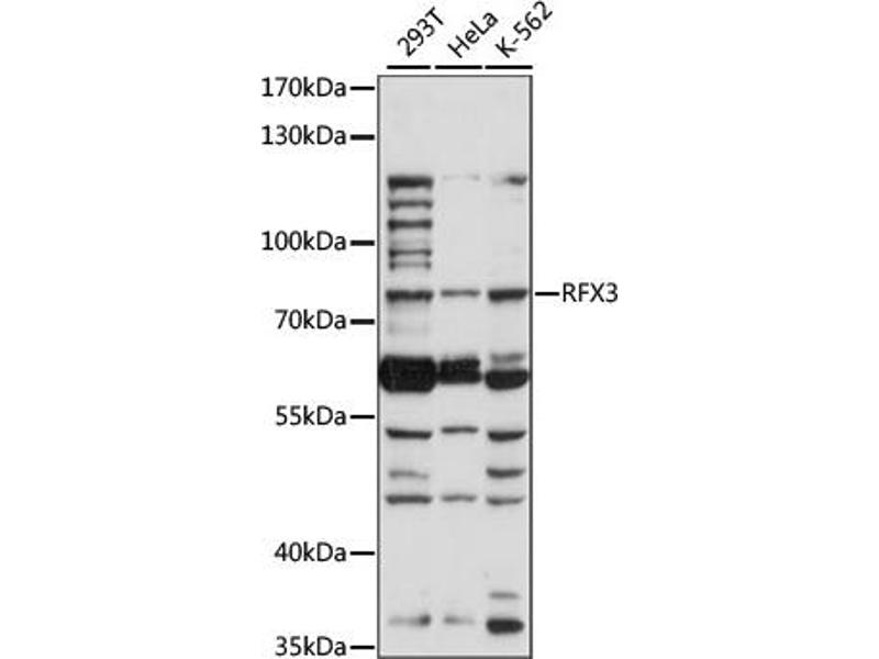 This gene is a member of the regulatory factor X gene family, which encodes transcription factors that contain a highly-conserved winged helix DNA binding domain. The protein encoded by this gene is structurally related to regulatory factors X1, X2, X4, and X5. It is a transcriptional activator that can bind DNA as a monomer or as a heterodimer with other RFX family members. Multiple transcript variants encoding different isoforms have been described for this gene.,RFX3,Epigenetics & Nuclear Signaling,Transcription Factors,RFX3