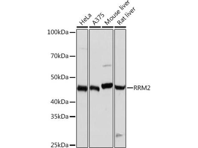 This gene encodes one of two non-identical subunits for ribonucleotide reductase. This reductase catalyzes the formation of deoxyribonucleotides from ribonucleotides. Synthesis of the encoded protein (M2) is regulated in a cell-cycle dependent fashion. Transcription from this gene can initiate from alternative promoters, which results in two isoforms that differ in the lengths of their N-termini. Related pseudogenes have been identified on chromosomes 1 and X. [provided by RefSeq, Sep 2009],R2, RR2, RR2M,Epigenetics & Nuclear Signaling,RRM2