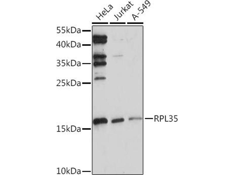 Ribosomes, the organelles that catalyze protein synthesis, consist of a small 40S subunit and a large 60S subunit. Together these subunits are composed of 4 RNA species and approximately 80 structurally distinct proteins. This gene encodes a ribosomal protein that is a component of the 60S subunit. The protein belongs to the L29P family of ribosomal proteins. It is located in the cytoplasm. As is typical for genes encoding ribosomal proteins, there are multiple processed pseudogenes of this gene dispersed through the genome. [provided by RefSeq, Jul 2008],L35,RPL35,Epigenetics & Nuclear Signaling,RNA Binding,RPL35