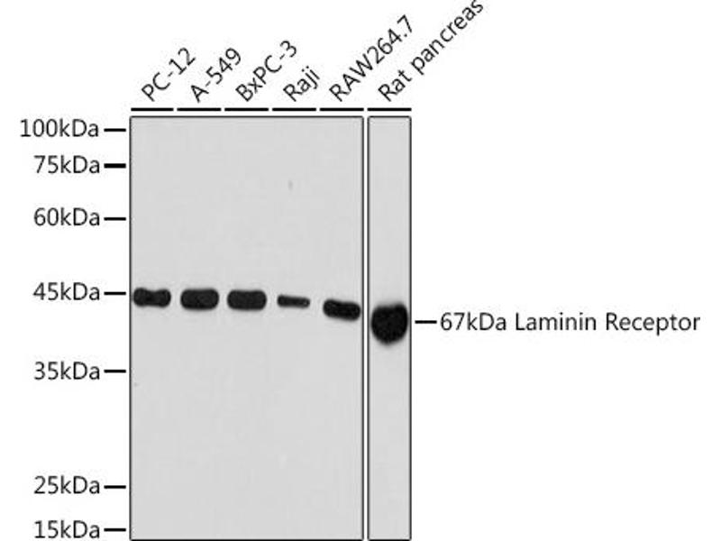 - Laminins, a family of extracellular matrix glycoproteins, are the major noncollagenous constituent of basement membranes. They have been implicated in a wide variety of biological processes including cell adhesion, differentiation, migration, signaling, neurite outgrowth and metastasis. Many of the effects of laminin are mediated through interactions with cell surface receptors. These receptors include members of the integrin family, as well as non-integrin laminin-binding proteins. This gene encodes a high-affinity, non-integrin family, laminin receptor 1. This receptor has been variously called 67 kD laminin receptor, 37 kD laminin receptor precursor (37LRP) and p40 ribosome-associated protein. The amino acid sequence of laminin receptor 1 is highly conserved through evolution, suggesting a key biological function. It has been observed that the level of the laminin receptor transcript is higher in colon carcinoma tissue and lung cancer cell line than their normal counterparts. Also, there is a correlation between the upregulation of this polypeptide in cancer cells and their invasive and metastatic phenotype. Multiple copies of this gene exist, however, most of them are pseudogenes thought to have arisen from retropositional events. Two alternatively spliced transcript variants encoding the same protein have been found for this gene. [provided by RefSeq, Jul 2008],37LRP, 67LR, ICAS, LAMBR, LAMR1, LBP, LBP/p40, LRP, LRP/LR, NEM/1CHD4, SA, lamR, p40,Angiogenesis,Cardiovascular,Cell Adhesion,Cell Biology & Developmental Biology,Cytoskeleton,Cytoskeleton_Intermediate Filaments,Extracellular Matrix,Neurodegenerative Diseases,Neuroscience,Signal Transduction,RPSA