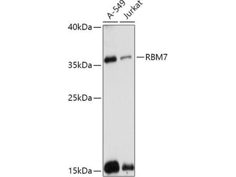 RNA-binding subunit of the trimeric nuclear exosome targeting (NEXT complex, a complex that functions as an RNA exosome cofactor that directs a subset of non-coding short-lived RNAs for exosomal degradation. NEXT is involved in surveillance and turnover of aberrant transcripts and non-coding RNAs. Binds preferentially polyuridine sequences and associates with newly synthesized RNAs, including pre-mRNAs and short-lived exosome substrates such as promoter upstream transcripts (PROMPTs, enhancer RNAs (eRNAs, and 3'-extended products from small nuclear RNAs (snRNAs. Participates in several biological processes including DNA damage response (DDR and stress response. During stress response, activation of the p38MAPK-MK2 pathway decreases RBM7-RNA-binding and subsequently the RNA exosome degradation activities, thereby modulating the turnover of non-coding transcriptome. Participates in DNA damage response (DDR, through its interaction with MEPCE and LARP7, the core subunits of 7SK snRNP complex, that release the positive transcription elongation factor b (P-TEFb complex from the 7SK snRNP. In turn, activation of P-TEFb complex induces the transcription of P-TEFb-dependent DDR genes to promote cell viability.,RBM7,Epigenetics & Nuclear Signaling,RNA Binding,Cell Biology & Developmental Biology,RBM7