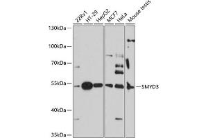 This gene encodes a histone methyltransferase which functions in RNA polymerase II complexes by an interaction with a specific RNA helicase. Multiple transcript variants encoding different isoforms have been found for this gene.,SMYD3,KMT3E,ZMYND1,ZNFN3A1,bA74P14.1,Epigenetics & Nuclear Signaling,Transcription Factors,Cancer,SMYD3