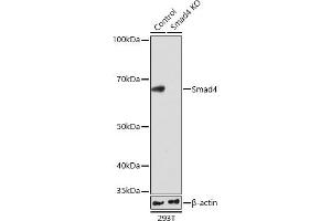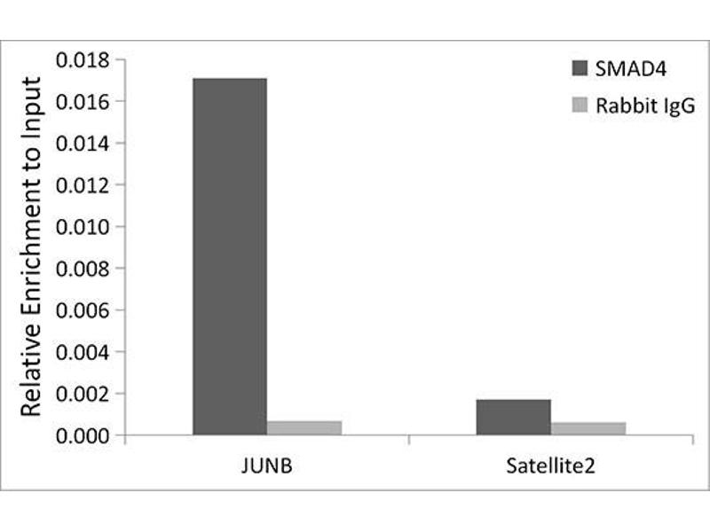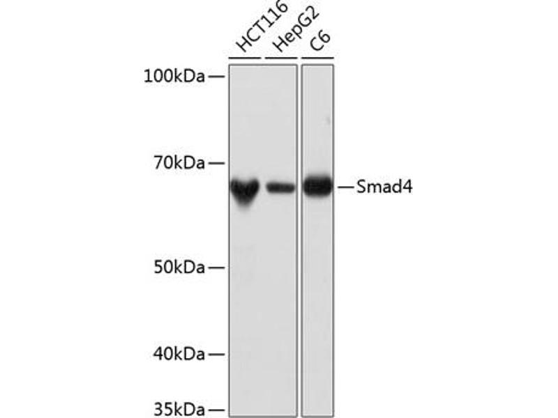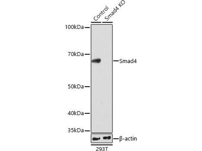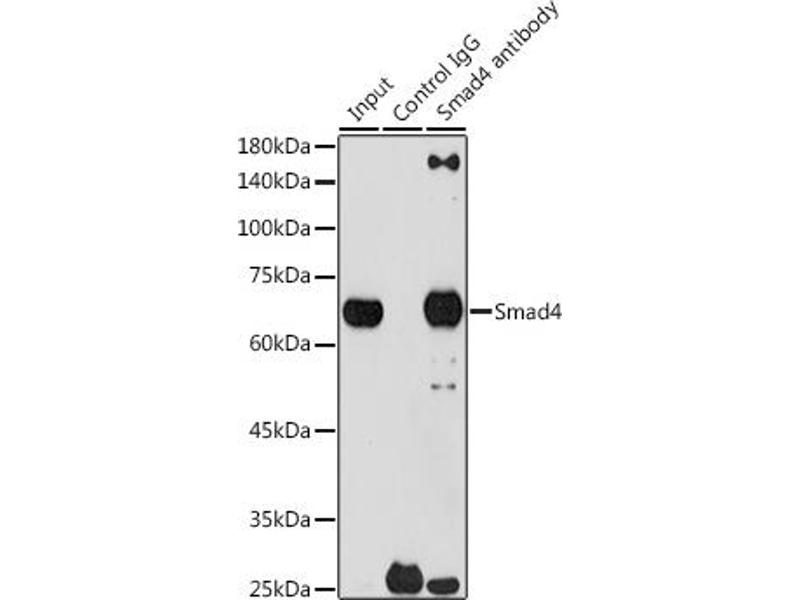 This gene encodes a member of the Smad family of signal transduction proteins. Smad proteins are phosphorylated and activated by transmembrane serine-threonine receptor kinases in response to TGF-beta signaling. The product of this gene forms homomeric complexes and heteromeric complexes with other activated Smad proteins, which then accumulate in the nucleus and regulate the transcription of target genes. This protein binds to DNA and recognizes an 8-bp palindromic sequence (GTCTAGAC) called the Smad-binding element (SBE). The Smad proteins are subject to complex regulation by post-translational modifications. Mutations or deletions in this gene have been shown to result in pancreatic cancer, juvenile polyposis syndrome, and hereditary hemorrhagic telangiectasia syndrome. [provided by RefSeq, Oct 2009],DPC4,JIP,MADH4,MYHRS,Smad4,SMAD4,Apoptosis,Cancer,Cardiovascular,Cell Biology & Developmental Biology,Cell Cycle,Endocrine & Metabolism,Epigenetics & Nuclear Signaling,ESC Pluripotency and Differentiation,G1/S Checkpoint,Heart,Heart_Cardiogenesis,Heart_Hypertrophy,Hypoxia,MAPK-JNK Signaling Pathway,Signal Transduction,Stem Cells,TGF-b-Smad Signaling Pathway,TGF-b-Smad Signaling Pathway_SMADs,Transcription Factors,Tumor suppressors,SMAD4