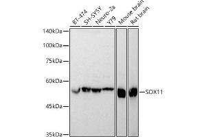 This intronless gene encodes a member of the SOX (SRY-related HMG-box) family of transcription factors involved in the regulation of embryonic development and in the determination of the cell fate. The encoded protein may act as a transcriptional regulator after forming a protein complex with other proteins. The protein may function in the developing nervous system and play a role in tumorigenesis.,SOX11,MRD27,Epigenetics & Nuclear Signaling,Transcription Factors,Cancer,Tumor biomarkers,Neuroscience,Stem Cells,Neural Stem Cells,SOX11