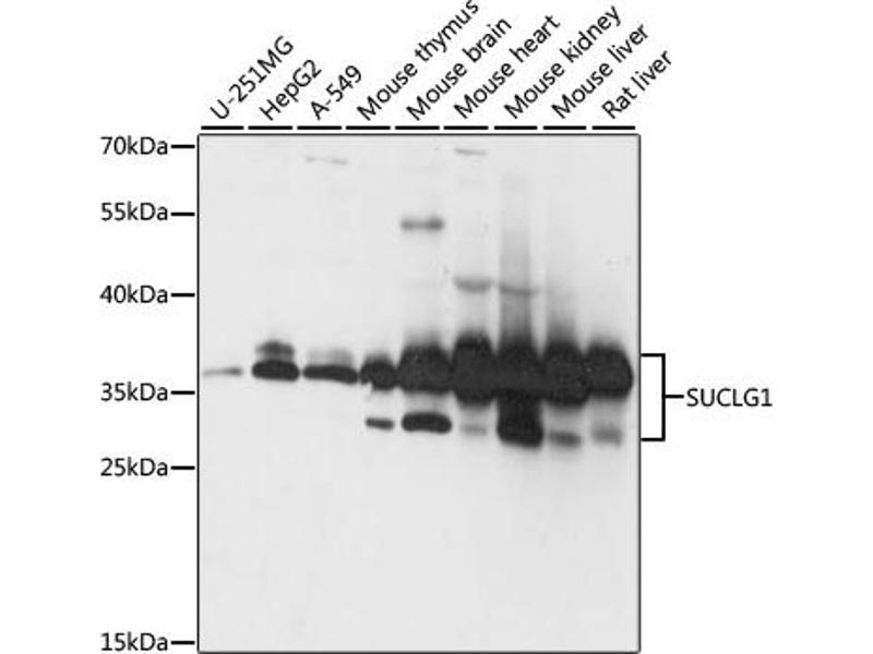 This gene encodes the alpha subunit of the heterodimeric enzyme succinate coenzyme A ligase. This enzyme is targeted to the mitochondria and catalyzes the conversion of succinyl CoA and ADP or GDP to succinate and ATP or GTP. Mutations in this gene are the cause of the metabolic disorder fatal infantile lactic acidosis and mitochondrial DNA depletion.,SUCLG1,GALPHA,MTDPS9,SUCLA1,Epigenetics & Nuclear Signaling,RNA Binding,Cancer,Signal Transduction,Endocrine & Metabolism,Mitochondrial metabolism,Mitochondrial markers,SUCLG1