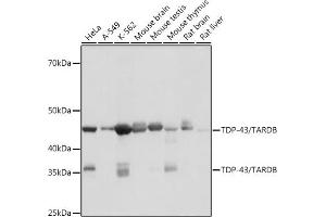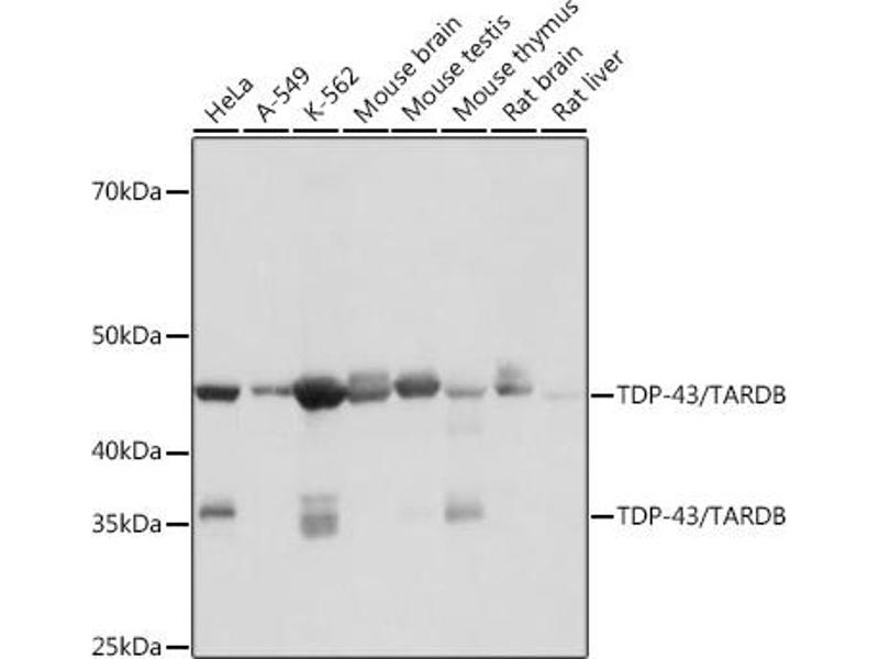 HIV-1, the causative agent of acquired immunodeficiency syndrome (AIDS), contains an RNA genome that produces a chromosomally integrated DNA during the replicative cycle. Activation of HIV-1 gene expression by the transactivator Tat is dependent on an RNA regulatory element (TAR) located downstream of the transcription initiation site. The protein encoded by this gene is a transcriptional repressor that binds to chromosomally integrated TAR DNA and represses HIV-1 transcription. In addition, this protein regulates alternate splicing of the CFTR gene. A similar pseudogene is present on chromosome 20. [provided by RefSeq, Jul 2008],ALS10,TDP-43,TARDBP,TDP43,Apoptosis,Cell Biology & Developmental Biology,Epigenetics & Nuclear Signaling,Neurodegenerative Diseases,Neurodegenerative Diseases Markers,Neurodegenerative Diseases_Amyotrophic lateral sclerosis,ALS,Neuroscience,Other Neurological disorders,RNA Binding,TARDBP