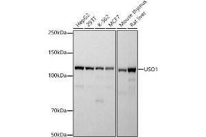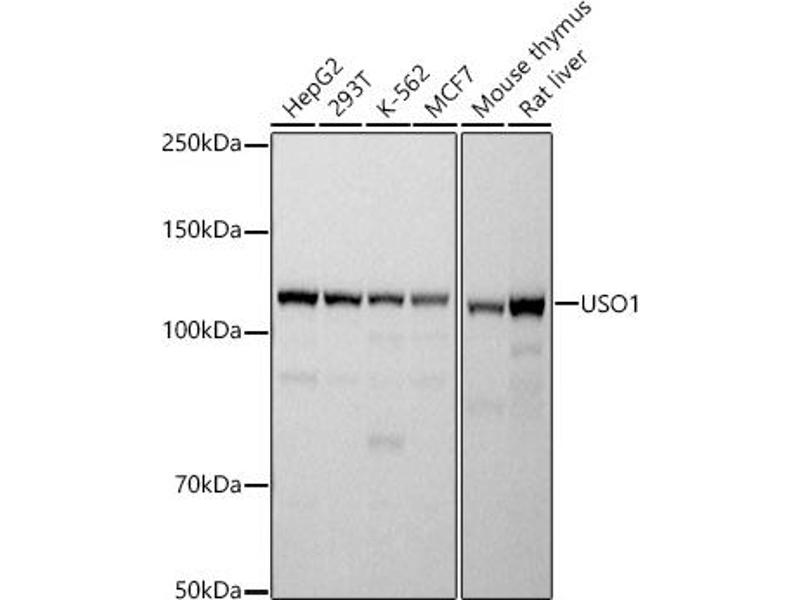 The protein encoded by this gene is a peripheral membrane protein which recycles between the cytosol and the Golgi apparatus during interphase. It is regulated by phosphorylation: dephosphorylated protein associates with the Golgi membrane and dissociates from the membrane upon phosphorylation. Ras-associated protein 1 recruits this protein to coat protein complex II (COPII) vesicles during budding from the endoplasmic reticulum, where it interacts with a set of COPII vesicle-associated SNAREs to form a cis-SNARE complex that promotes targeting to the Golgi apparatus. Alternative splicing results in multiple transcript variants.,USO1,P115,TAP,VDP,Epigenetics & Nuclear Signaling,RNA Binding,Signal Transduction,USO1