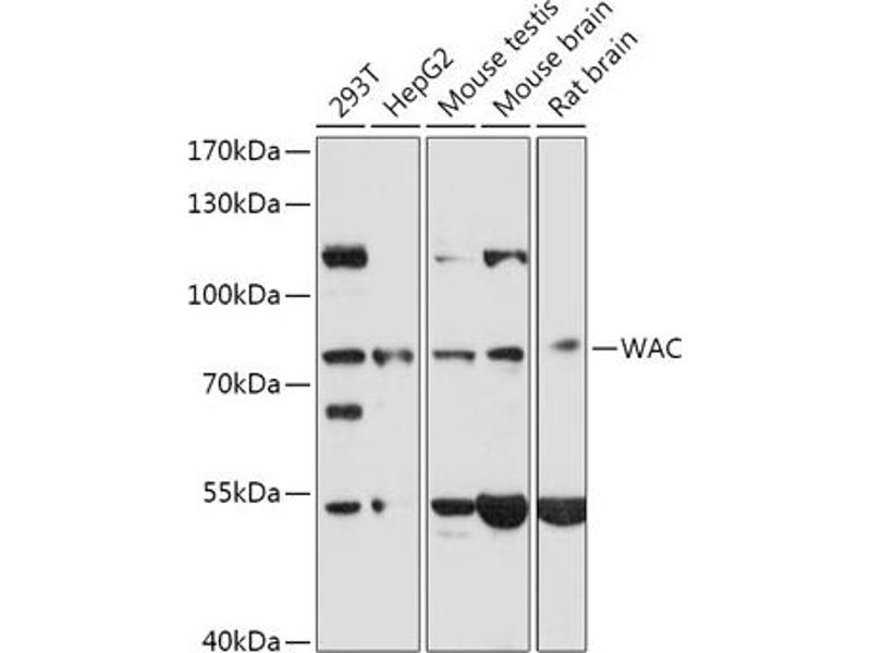The protein encoded by this gene contains a WW domain, which is a protein module found in a wide range of signaling proteins. This domain mediates protein-protein interactions and binds proteins containing short linear peptide motifs that are proline-rich or contain at least one proline. This gene product shares 94 % sequence identity with the WAC protein in mouse, however, its exact function is not known. Alternative splicing results in multiple transcript variants. [provided by RefSeq, Dec 2008],BM-016,DESSH,PRO1741,Wwp4,WAC,Cell Biology & Developmental Biology,WAC