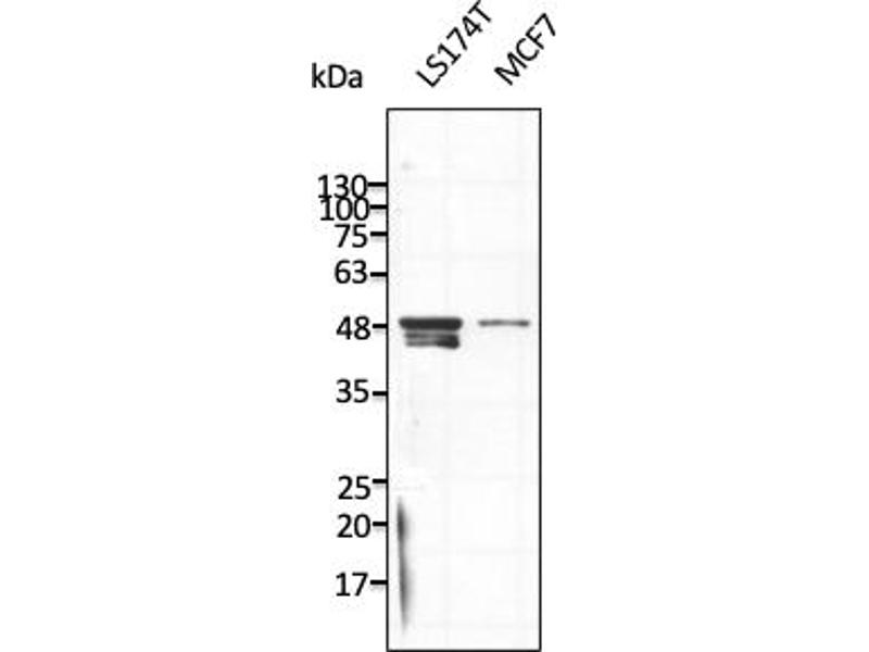 - Detects endogenous levels of all variants (var1 52 KDa, var2 49.5 KDa, var3 27.3 KDa, var4 44.8KDa, var5 41.7 KDa, var6 41.7 KDa) of TUBB in different cell lines by Western blot.