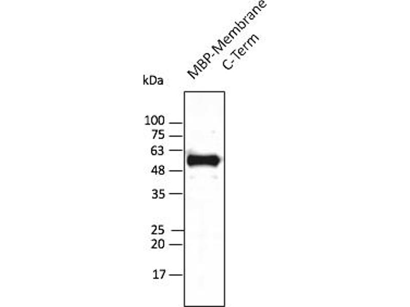 - Affinity purified recombinant fusion protein using the C-terminal of Membrane protein (residues 100 to stop) and produced in E. coli.