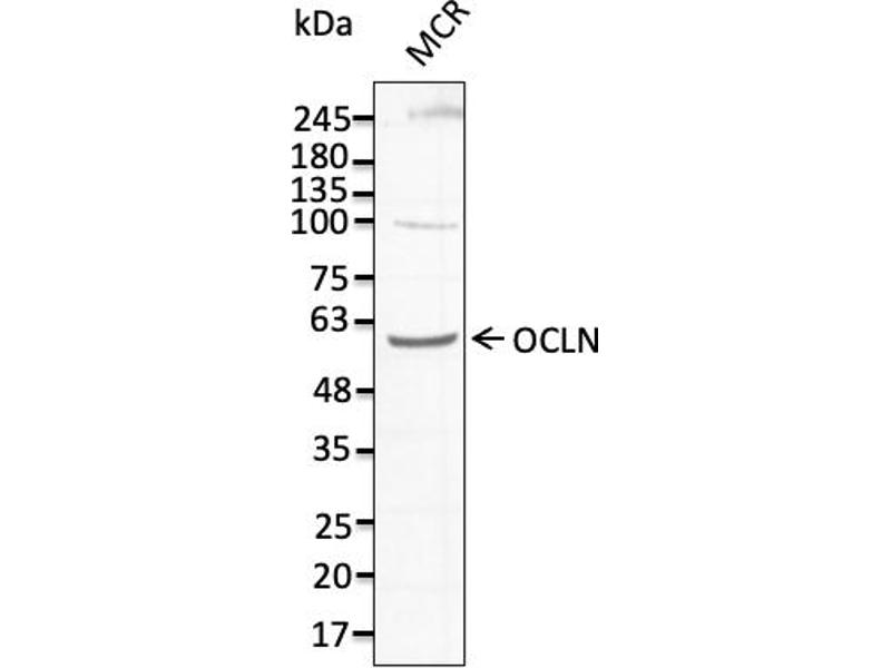 Detects endogenous levels of OCLN in MCR, IMCD3, COS7, MDCK, HUH, HEK293, MCF7, mouse brain by Western blot.