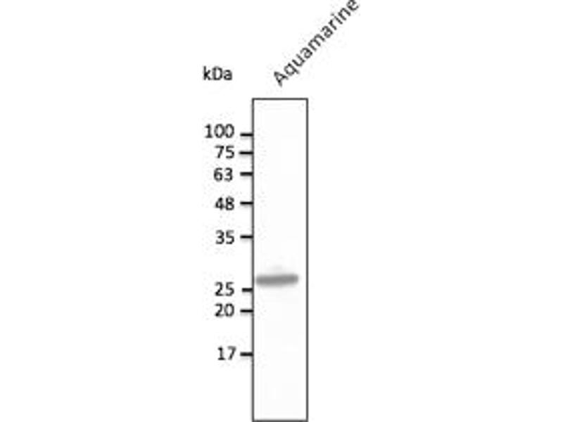 Goat polyclonal antibody to Aquamarine (Aquamarine fluorescent protein). Aquamarine is a basic (constitutively fluorescent), monomeric engineered derivate of green fluorescent protein (GFP) isolated from Aequorea victoria. Aquamarine is a ~27 kDa protein that is optimally excited at a 430 nm and has a maximum of emission at 474 nm. It is used in research as a reporter to label and study the biology of the cell using a wide range of applications.