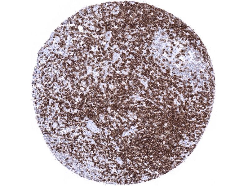 Positive Control: Tonsil: A strong CD5 staining of virtually all T-cells in both T-zones and in germinal centres as well as an at least weak to moderate staining of dispersed B-cells in the mantle zone should be seen.