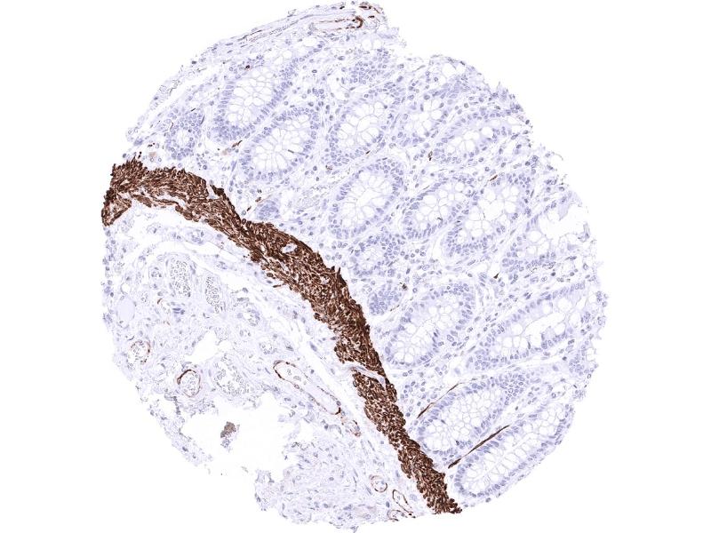Positive Control: Appendix: Smooth muscle cells in the lamina muscularis mucosae and muscularis propria must show a strong cytoplasmic staining while staining should be at least moderate in most smooth muscle cells of blood vessels and in dispersed myofibroblasts.