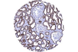 Positive Control: Kidney: In kidney, distal tubule cells must show a strong predominantly membranous staining, while at a least moderate predominantly basolateral staining must be seen in the majority of proximal tubules cells and in scattered epithelial cells lining the Bowman capsule.