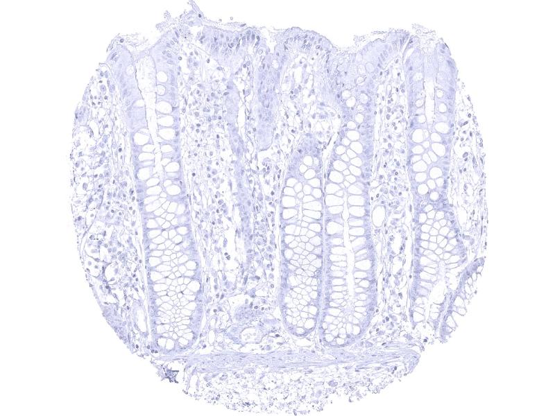 Negative Control: Colon: GP2 staining should be completely absent in glandular and stromal cells.