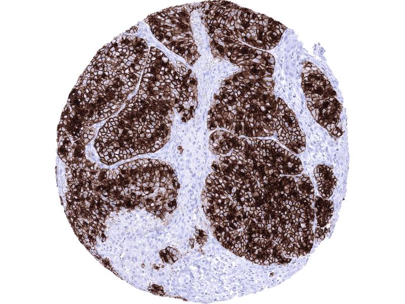 Positive Control: Pancreas: Acinar cells should show a strong immunostaining with apical predominance. Duodenum: Glandular cells of Brunner glands should show a weak to moderate GP2 positivity.