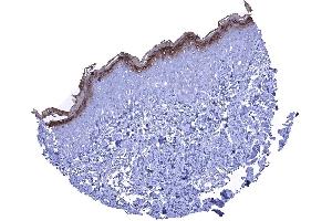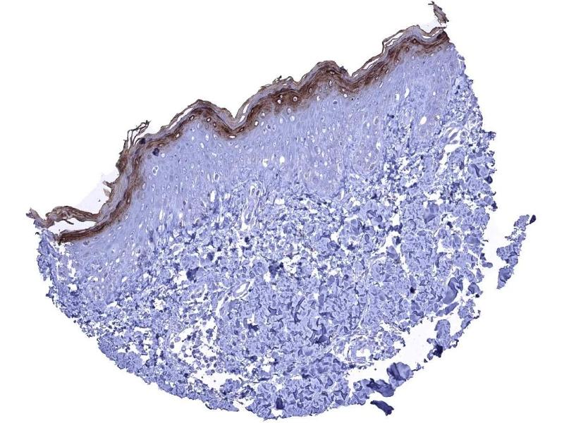 Positive Control: Skin: A strong KLK7 staining should be seen in the stratum granulosum and possibly also in the keratinizing cell layers.