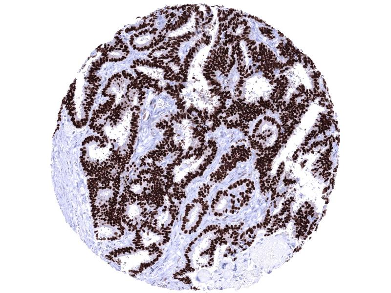 Positive Control: Uterine cervix: almost all columnar epithelial cells, basal squamous epithelial cells and most of the stromal cells must show a strong nuclear staining with only minimal cytoplasmic staining.