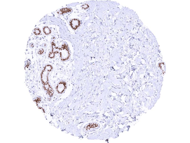 Positive Control: Breast: A strong TRPS1 staining should be seen in luminal breast epithelial cells. (For low-level TRPS1 detection: Testis: A weak nuclear TRPS1 staining should be seen in spermatogonia.)