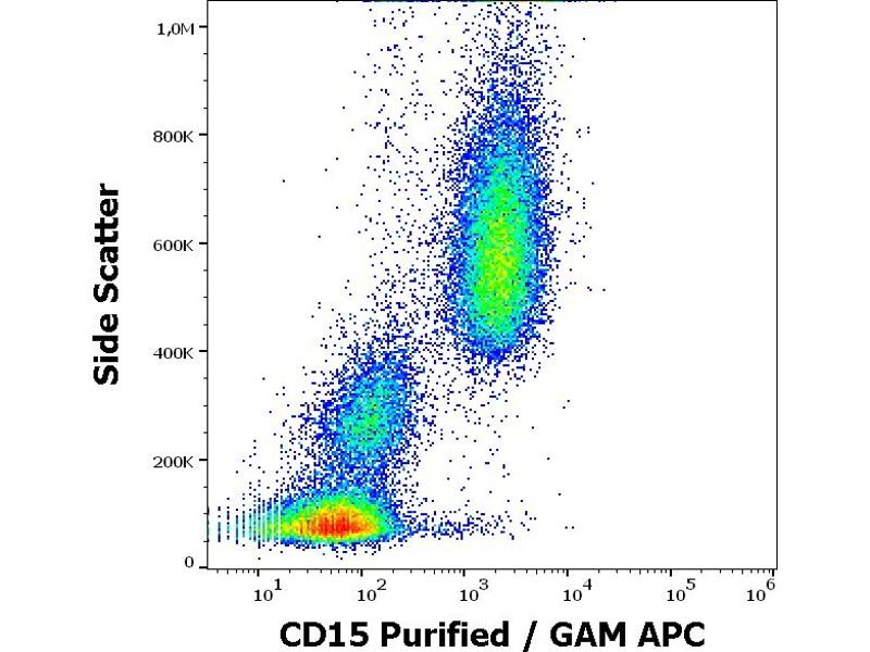 Mouse monoclonal antibody W6D3 recognizes CD15 in nonterminal position on extracellular glycoproteins. CD15 (a cell membrane 3-fucosyl-N-acetyllactosamine, 3-FAL) is strongly expressed on granulocytes, monocytes, macrophages, mast cells, it is also present on Langerhans cells and some myeloid precursors cells. This is a non-IgM anti-CD15 antibody.