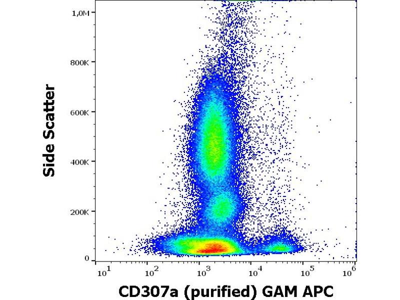 Fc receptor like 1,CD307a is a type I transmembrane glycoprotein of the Fc receptor family. It contains two ITAM motifs in its cytoplasmic domain. CD307a is expressed mainly on the surface of mature B-cells, and is down-regulated in germinal center B-cells. Expression of CD307a is higher in patients with autoimmune diseases, compared with healthy controls.,FcRL1, FcRH1, IRTA5