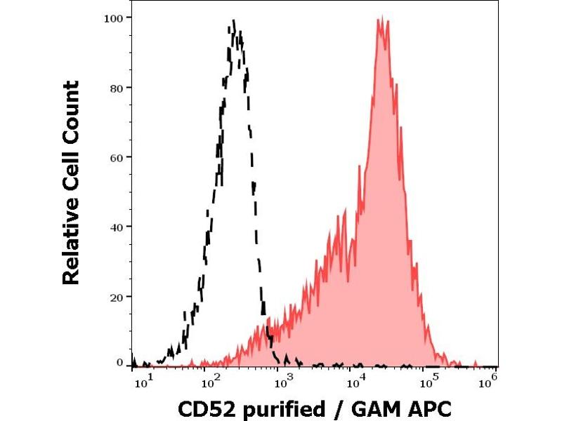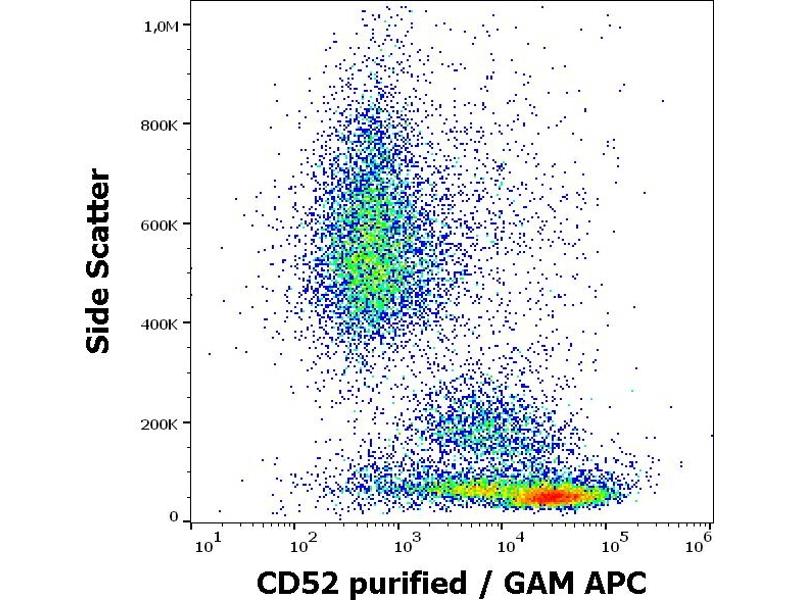 - CD52 Molecule,CD52 (CAMPATH-1, HE5) is a highly glycosylated GPI-anchored 21-28 kDa glycopeptide which is present at high levels on lymphocytes, macrophages, epithelial cells of male reproductive tract and mature sperm. Its 12-amino acid beckbone carries a complex N-linked carbohydrate moiety, which differs between sperm and leukocyte CD52, as well as the GPI anchor does. CD52 can be acquired by sperm cells from seminal plasma, where it is released by epithelial cells. Although CD52 is not an essential T-cell costimulator, its triggering results in activation of normal human T cells. CD52 is a very good target for antibody/complement-mediated cell lysis.,CAMPATH-1, HE5, ESPE5