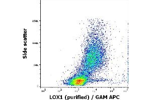 Oxidized low density lipoprotein receptor 1,LOX1, a 31 kDa type II transmembrane protein, is a C-type lectin, functioning as a scavenger receptor for e.g. oxidized low density lipoprotein, apoptotic heat shock proteins, or CRP. It is expressed by macrophages, fibroblasts, platelets, endothelial cells, and smooth muscle cells, and its defects can lead to atherosclerosis. Its expression is enhanced under inflammatory conditions. Multiple splicing variants have been identified.,OLR1, SLOX1, SCARE1, CLEC8A