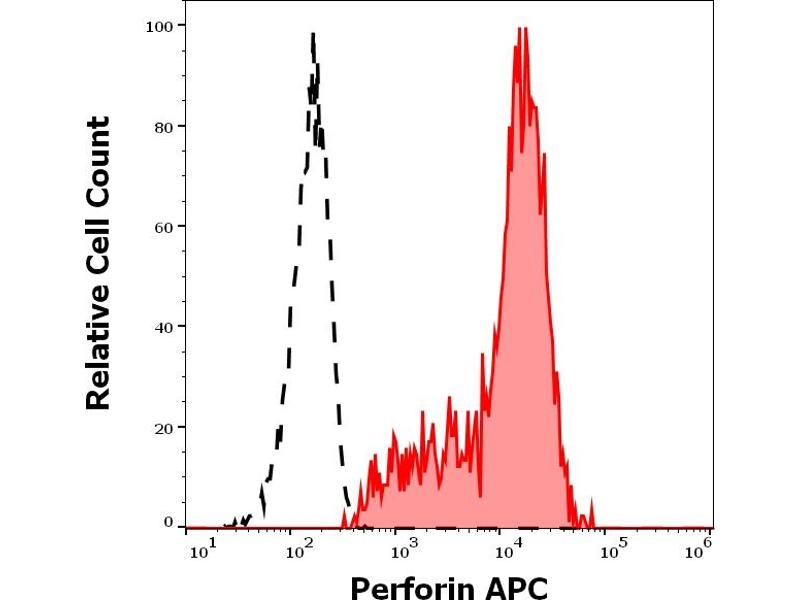 The mouse monoclonal antibody dG9 (also known as deltaG9) recognizes perforin, a 70 kDa protein expressed in cytoplasmic granules of cytotoxic T cells and NK cells.
