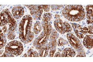 Immunohistochemistry on paraffin sections. Suggested dilution: 1:200 for 30 minutes at 25°C. Heat induced epitope retrieval using Epitope Retrieval Solution pH 9.0. This is provided as a guide and users should determine their own optimal working dilutions. Technical note: When utilised in immunohistochemistry, the use of H2O2 to block endogenous peroxidase has been shown to have a detrimental effect on the epitope recognized. It is, therefore, CRITICAL that blocking with H2O2 should be carried out after application of the primary antibody with solutions of no greater than 3 % . If these recommendations are not followed, staining intensity will be reduced. It is not recommended for use with PBS, since the use of PBS based wash buffers and possibly PBS based antibody diluents gives increased background staining and decreased staining intensity. Immunohistochemical (IHC) staining techniques allow for the visualization of antigens via the sequential application of a specific antibody to the antigen (primary antibody), a secondary antibody to the primary antibody and an enzyme complex with a chromogenic substrate with interposed washing steps. The enzymatic activation of the chromogen results in a visible reaction product at the antigen site. The specimen may then be counterstained and coverslipped. Results are interpreted using a light microscope.