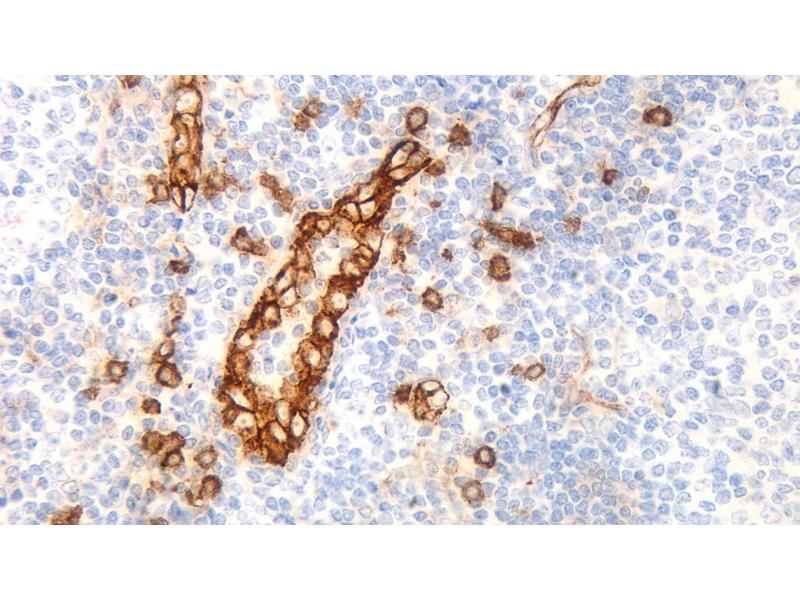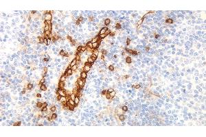 Immunohistochemistry on paraffin sections. Suggested dilution: 1:100 for 30 minutes at 25°C. Heat induced epitope retrieval using Epitope Retrieval Solution pH 9.0. Immunohistochemical (IHC) staining techniques allow for the visualization of antigens via the sequential application of a specific antibody to the antigen (primary antibody), a secondary antibody to the primary antibody and an enzyme complex with a chromogenic substrate with interposed washing steps. The enzymatic activation of the chromogen results in a visible reaction product at the antigen site. The specimen may then be counterstained and coverslipped. Results are interpreted using a light microscope.