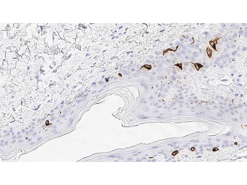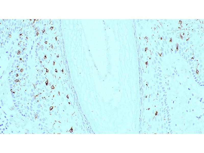 Immunohistochemistry on paraffin sections. Heat Induced Epitope Retrieval (HIER): Epitope Retrieval Solution pH 6. Suggested dilution: 1:50 for 30 minutes at 25 °C. This is provided as a guide and users should determine their own optimal working dilutions. Immunohistochemical (IHC) staining techniques allow for the visualization of antigens via the sequential application of a specific antibody to the antigen (primary antibody), a secondary antibody to the primary antibody and an enzyme complex with a chromogenic substrate with interposed washing steps. The enzymatic activation of the chromogen results in a visible reaction product at the antigen site. The specimen may then be counterstained and coverslipped. Results are interpreted using a light microscope.