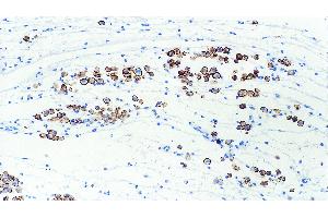 Immunohistochemistry on paraffin sections. Heat Induced Epitope Retrieval (HIER): Epitope Retrieval Solution pH 6. Suggested dilution: 1:40 for 30 minutes at 25 °C. This is provided as a guide and users should determine their own optimal working dilutions. Immunohistochemical (IHC) staining techniques allow for the visualization of antigens via the sequential application of a specific antibody to the antigen (primary antibody), a secondary antibody to the primary antibody and an enzyme complex with a chromogenic substrate with interposed washing steps. The enzymatic activation of the chromogen results in a visible reaction product at the antigen site. The specimen may then be counterstained and coverslipped. Results are interpreted using a light microscope.