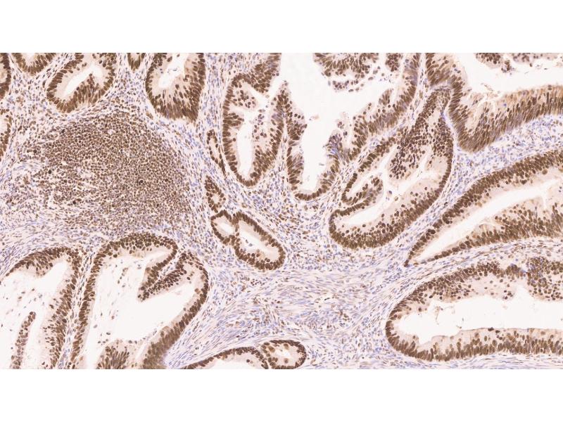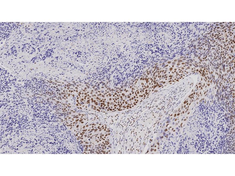 Heat Induced Epitope Retrieval (HIER): Epitope Retrieval Solution pH 6. Suggested dilution: 1:50 for 30 minutes at 25 °C. This is provided as a guide and users should determine their own optimal working dilutions. The performance of this antibody should be validated when utilized with other manual staining systems or automated platforms. Immunohistochemical (IHC) staining techniques allow for the visualization of antigens via the sequential application of a specific antibody to the antigen (primary antibody), a secondary antibody to the primary antibody and an enzyme complex with a chromogenic substrate with interposed washing steps. The enzymatic activation of the chromogen results in a visible reaction product at the antigen site. The specimen may then be counterstained and coverslipped. Results are interpreted using a light microscope.