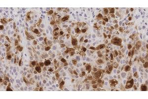 Immunohistochemistry on paraffin sections. Heat Induced Epitope Retrieval (HIER): Epitope Retrieval Solution pH 6. Suggested dilution: 1:100 for 30 minutes at 25 °C. This is provided as a guide and users should determine their own optimal working dilutions. Immunohistochemical (IHC) staining techniques allow for the visualization of antigens via the sequential application of a specific antibody to the antigen (primary antibody), a secondary antibody to the primary antibody and an enzyme complex with a chromogenic substrate with interposed washing steps. The enzymatic activation of the chromogen results in a visible reaction product at the antigen site. The specimen may then be counterstained and coverslipped. Results are interpreted using a light microscope.