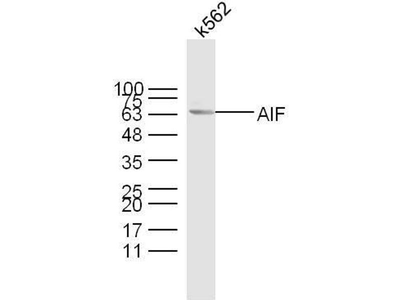 Background: Functions both as NADH oxidoreductase and as regulator of apoptosis. In response to apoptotic stimuli, it is released from the mitochondrion intermembrane space into the cytosol and to the nucleus, where it functions as a proapoptotic factor in a caspase-independent pathway. In contrast, functions as an antiapoptotic factor in normal mitochondria via its NADH oxidoreductase activity. The soluble form (AIFsol) found in the nucleus induces 'parthanatos' i.e. caspase-independent fragmentation of chromosomal DNA. Interacts with EIF3G,and thereby inhibits the EIF3 machinery and protein synthesis, and activates casapse-7 to amplify apoptosis. Plays a critical role in caspase-independent, pyknotic cell death in hydrogen peroxide-exposed cells. Binds to DNA in a sequence-independent manner.