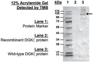 DGK catalyzes a reaction terminating the protein kinase C (PKC)mediated signaling by converting diacylglycerol (DAG) to phosphatidic acid (PA), a signaling lipid which is involved in DNA synthesis, phospholipid synthesis, and regulation of several enzymes. DAG is an intermediate in phospholipid synthesis which functions as an allosteric activator of PKC. Research shows the zeta isoform of DGK undergoes tissue-specific alternative splicing resulting in an elongated N terminus enzyme predominantly in muscle.