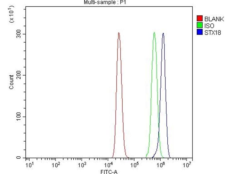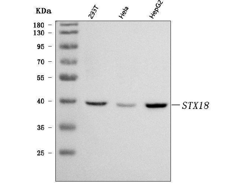 - Anti-Syntaxin 18/STX18 Antibody (ABIN7599259). Tested in ELISA, Flow Cytometry, IF, IHC, WB applications. This antibody reacts with Human. This is a premium antibody that guarantees superior quality, high affinity, and strong signals with minimal background in Western blot applications.