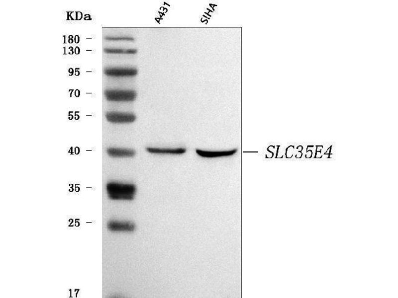 - Anti-SLC35E4 Antibody (ABIN7599299). Tested in ELISA, Flow Cytometry, WB applications. This antibody reacts with Human. This is a premium antibody that guarantees superior quality, high affinity, and strong signals with minimal background in Western blot applications.