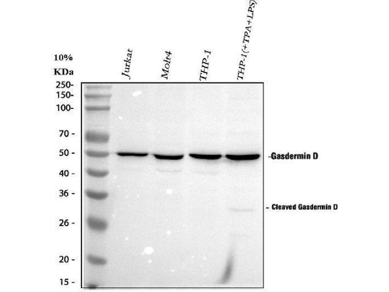 Background: Gasdermin D is a member of the gasdermin family. Members of this family appear to play a role in regulation of epithelial proliferation. Gasdermin D has been suggested to act as a tumor suppressor. Alternatively spliced transcript variants have been described.