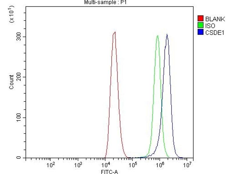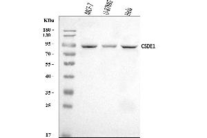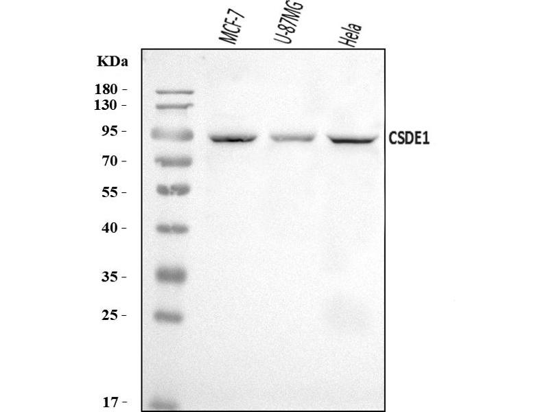 Background: Cold shock domain-containing protein E1 is a protein that in humans is encoded by the CSDE1 gene. Originally described as the product of an active transcription unit located upstream of the N-RAS gene, CSDE1 (cold shock domain-containing protein E1) is a highly conserved RNA-binding protein containing five cold-shock domains. CSDE1 is mostly localized in the cytoplasm where it interacts with distinct protein complexes involved in the post-transcriptional regulation of numerous mRNAs in a dynamic and complex manner. CSDE1 plays a role in maintaining the undifferentiated state of human embryonic stem cells (hESCs), and its loss results in accelerated neural differentiation and neurogenesis, partially via post-transcriptional regulation of fatty acid binding protein 7 (FABP7) and vimentin (VIM) mRNAs. In human melanoma, increased CSDE1 protein expression has been shown to modulate the levels of pro-oncogenic factors such as vimentin or RAC1 and tumor suppressors such as PTEN, thus promoting tumor invasion and metastasis.