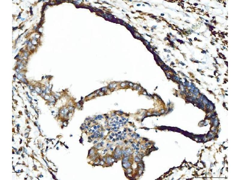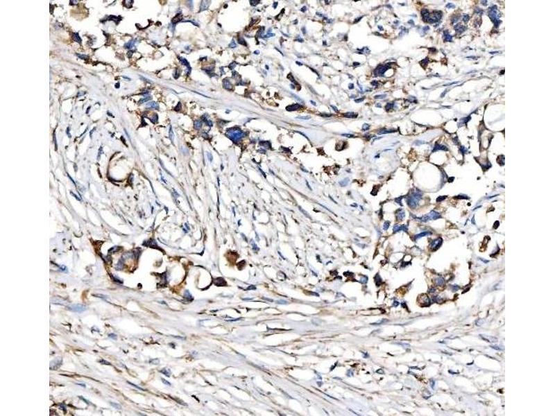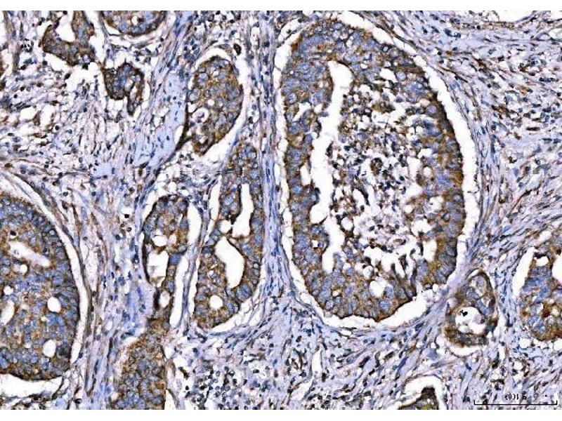 Tissue Specificity: Detected in T-47D, MDA-MB-175 and HBL-100 breast carcinoma cells, A-431 epidermoid carcinoma cells, SW48 and SNU-C2B colon carcinoma cells and Hs 294T melanoma cells (at protein level). Expressed at low levels in most adult tissues and is highest in the brain, lung, placenta and kidney. Lower levels of expression are detected in melanocytes, heart, liver, skeletal muscle and pancreas. Abundant in breast carcinoma cell lines. In the colonic mucosa, expressed in epithelia but not in the connective tissue of the lamina propria. In the thyroid gland, expressed in the epithelium of the thyroid follicles. In pancreas, expressed in the islets of Langerhans cells, but not in the surrounding epithelial cells of the exocrine pancreas. In kidney, expressed in the epithelia of the distal tubules. Not expressed in connective tissue, endothelial cells, adipose tissue, muscle cells or cells of hematopoietic origin.