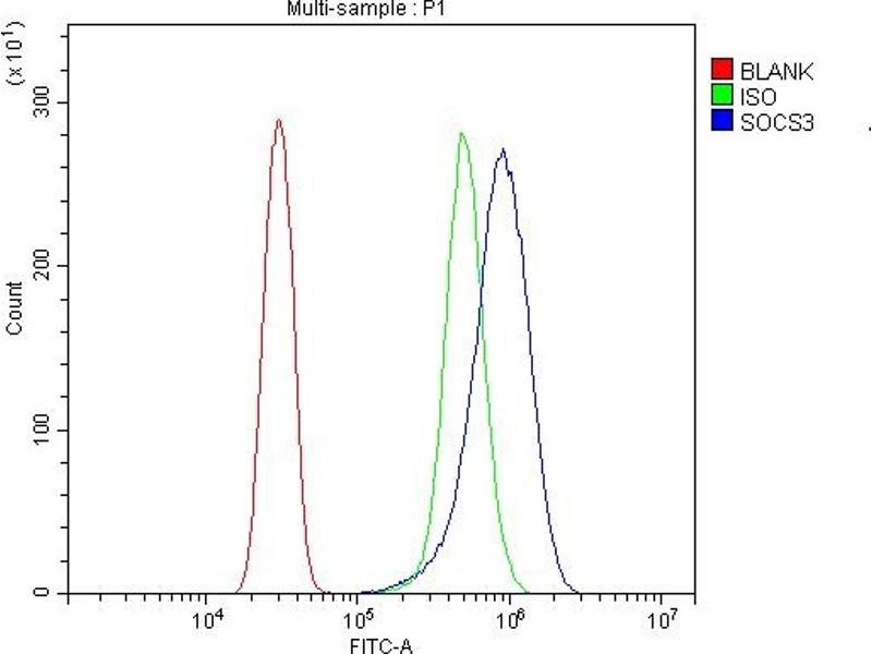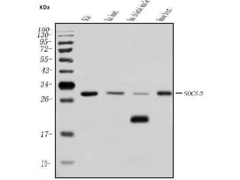 Background: SOCS3 (Suppressor of cytokine signaling 3) is a protein that in humans is encoded by the SOCS3 gene. SOCS3 is transiently expressed by multiple cell lineages within the immune system and functions predominantly as a negative regulator of cytokines that activate the JAK-STAT3 pathway. This gene encodes a member of the STAT-induced STAT inhibitor (SSI), also known as suppressor of cytokine signaling (SOCS), family. SSI family members are cytokine-inducible negative regulators of cytokine signaling. The expression of this gene is induced by various cytokines, including IL6, IL10, and interferon (IFN)-gamma. The protein encoded by this gene can bind to JAK2 kinase, and inhibit the activity of JAK2 kinase. For signaling of IL-6, Epo, GCSF and Leptin, binding of SOCS3 to the respective cytokine receptor has been found to be crucial for the inhibitory function of SOCS3. Studies of the mouse counterpart of this gene suggested the roles of this gene in the negative regulation of fetal liver hematopoiesis, and placental development.