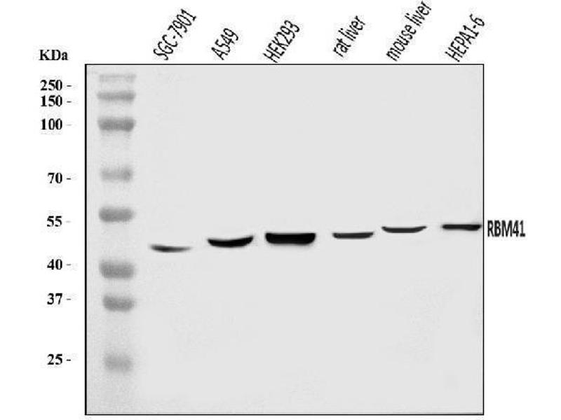 - Anti-RBM41 Antibody (ABIN7599951). Tested in ELISA, Flow Cytometry, WB applications. This antibody reacts with Human, Mouse, Rat. This is a premium antibody that guarantees superior quality, high affinity, and strong signals with minimal background in Western blot applications.